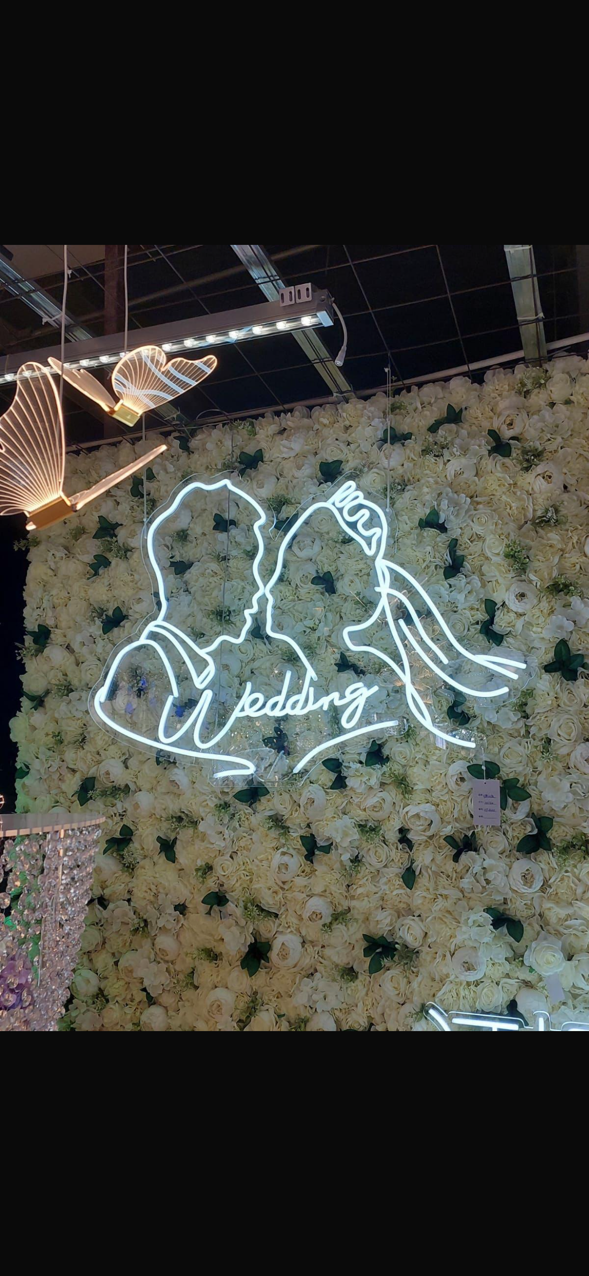 שלט לד ניאון מעוצב בצורת חתן וכלה עם כיתוב Wedding, יוצר אווירה רומנטית, אלגנטית ומרשימה. מושלם כרקע לצילומים, קיר פרחים, חופה, עמדת קבלת פנים ועיצוב חללים באירועי חתונה